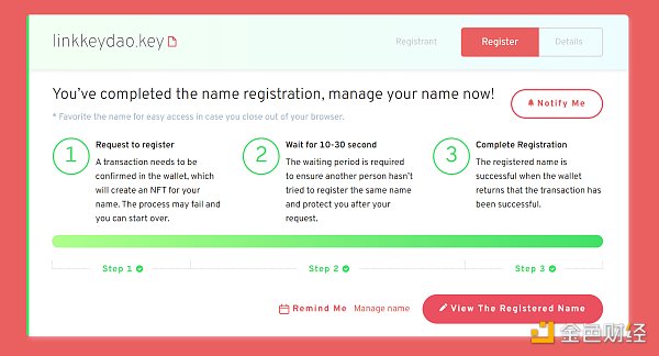 SNS(社交名称系统)是LinkKey中一个非常重要的分散式用户名系统。该协议规定,所有用户名都是***.key,例如alice.key,1个密钥只能绑定1个ETH(ERC20),该名称将自动生成为NFT,未使用的名称可以自由传输和交易。如果个人NFT和社区NFT是通过sns发放的,则无法交易该名称。