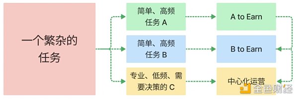 如果我们看到一个场景具备2earn的潜力,那么一定要尽可能把他拆分,其中高频的行为,可量化的行为,可以设计成2earn模型;不可量化的、复杂的、个性化的行为部分,保留中心化的业务模式继续运作。