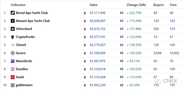 根据CryptoSlam的数据,在24小时销售额最高的10个NFT项目中,有8个项目的交易量增长了至少115%,只有Goblintown(35.54%)和Moonbirds(64.11%)低于这个数字。