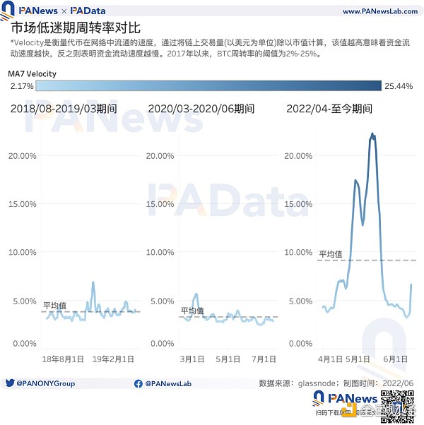 3)与前两次历史低迷期相比,当前期间内的链上用户处于更为活跃的状态。另外,当前期间内的资金也处于更为活跃的状态,不仅换手频率更高,且周转率也更高。这通常说明市场还处于高度变化中。