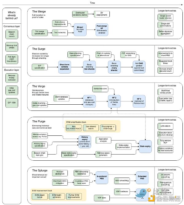 几天前,在巴黎举行的年度以太坊会议 EthCC 上,Vitalik发表了45分钟的演讲,详细介绍了以太坊的长期愿景以及合并后的发展。令人惊讶的是,他指出,他认为以太坊在合并后只会完成 55%,这意味着以太坊还不到最终状态的一半。在去年12月发布的路线图中,他详细介绍了五个不同的目标:Merge、Surge、Verge、 Purge、Splurge。这些目标将帮助以太坊达到其最终状态。让我们来看看这些目标,以及它们为何如此重要。