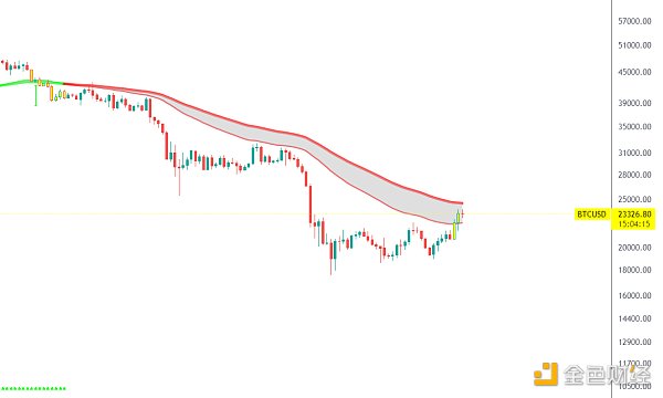 今日行情继续上攻,最高涨至24000附近再回落,图中看日线还未突破上方压力带,周线也到了下降趋势线一带,近期反弹已经到了压力区,短线要注意下,大方向自去年见顶69000一路回落到目前,BTC整体可以看作在一个下降楔形三角内运行,而这种结构后面一般向上突破概率大,下方有长期上行通道支撑线,前期大跌多次插针也未有效跌破,点位还是19000一带,综合看BTC周线级别三角末端收敛,短期遇阻不过中期变盘预计还是向上概率大,我们看下方指数线已见红并拐头上行,前期这种走势在2014年、2018年和2020年各轮熊底,所以一旦反弹后再次探底又将是中长线机会。