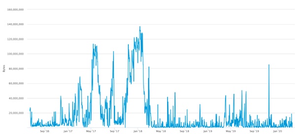 比特币的内存池规模在2018年1月达到创纪录的最高值,超过130MB/块,就在此前几天,比特币刚刚冲上了20000美元历史高点。