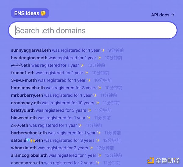 ENS Ideas 是一个比较简单的域名实时注册更新网站,也允许直接搜索域名后定向至 ENS DApp。