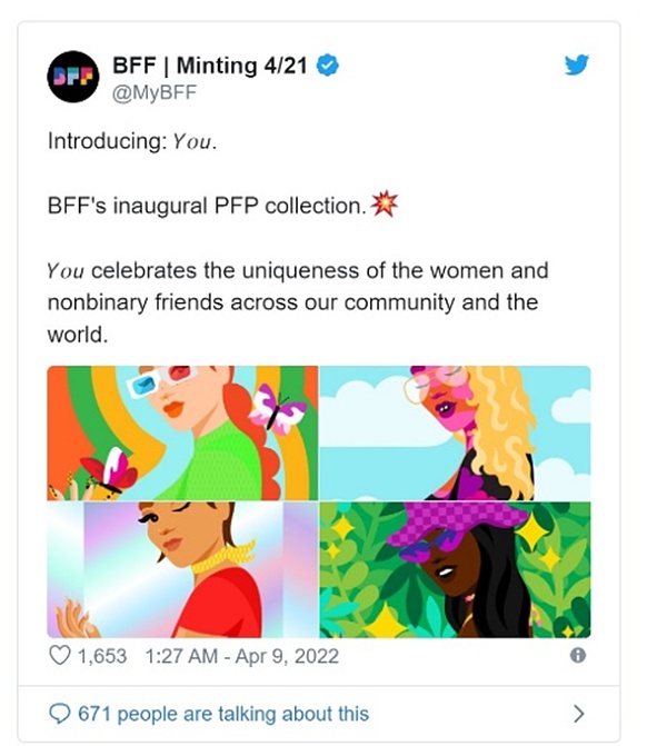“What a time to be alive. Never before has the Internet made it possible for people all across the world to collaborate and build the brand of the future. We’re excited by what this means for BFF: live events, merchandise and collabs, product creation, NFT drops, and more. Our community will have the opportunity to earn rewards based on participation and engagement—so jump in!