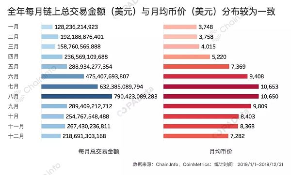 总体而言,全年每月链上交易总额与币价表现出一定的量价一致性,6、7、8月链上交易总额是全年中比较高的月份,同时也是币价较高的月份。
