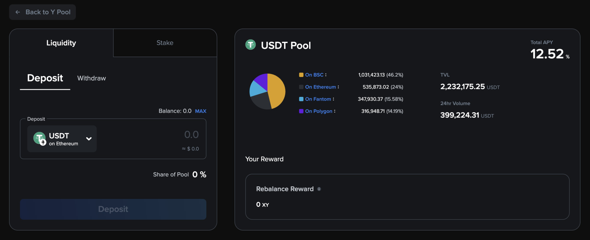 Y Pool 是一个收益池,用于激励用户提供同一资产在多条链上的跨链流动性。用户可以将 ERC20 USDT、BEP20 USDT、Polygon USDT 存入 USDT Y Pool 获得 xy USDT。这些不同的 USDT 将用于为 X Swap 提供流动性。xyUSDT 持有者可以赚取通过 X swap 产生的交换费,并获得 XY Token 作为奖励。