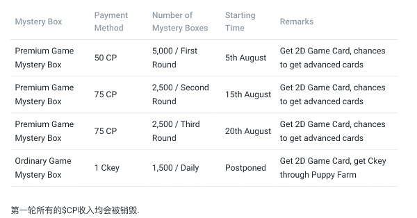 这是目前CoPuppy的主要玩法,通过购买2D盲盒(购买方式如下图),开出不同品种、不同稀有度和不同性别的狗狗卡牌。目前第一轮和第二轮盲盒已售罄。8月20日将开放新卡牌销售。