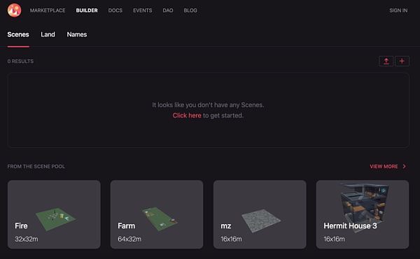 Decentraland中的四大主要模块——虚拟世界本体Get Started、市场MarketPlace、土地建造Builder和社区治理DAO都能够在其首页上找到醒目的入口。