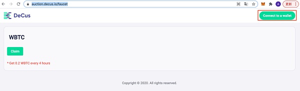 访问??https://auction.decus.io/faucet,点击页面右上角的[Connect to a wallet]。