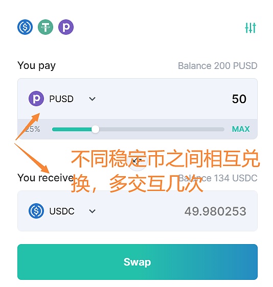 例如我们把USDC兑换为USDT,输入USDC的数量,然后会自动显示USDT数量。