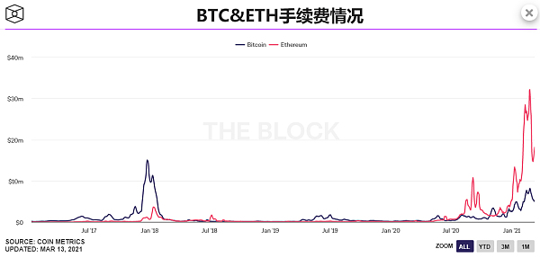 众人皆知,去年下半年开始,以太坊手续费就居高不下。特别是进入2021年以来,以太坊手续费与比特币的差距越来越夸张,有时以太坊单日的手续费就能达到3000万美元,超出比特币的4倍。