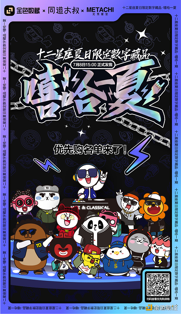 金色数藏平台联合元気星空,携手星座娱乐头部IP同道大叔发行十二星座夏日限定《嘻哈一夏》数字藏品,将于今日15:00在金色数藏平台正式开启发售!