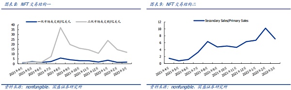 用户对NFT的接受度超预期,二级交易渐占市场主导。Opensea的每日活跃用户数在今年年初屡创新高,今年一月份的平台交易额提升至44.91亿美元,环比增长102%。从NFT市场整体数据来看,年初的市场交易并没有回暖到去年8月的高位,但市场交易结构出现明显变化趋势——二级市场成交额比一级市场成交额该比例增长5倍左右,表明在NFT市场用户间的二级流转交易开始占主导地位。