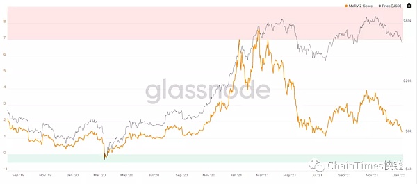用于评估比特币相对于其“公允价值”何时被高估/低估,该指标在高估、低估区间,并没有强烈的多空指向,但目前数值距离低估区域(看涨)较近,29000时该值是1.114,目前是1.381,历史上看1.1附近有支撑。