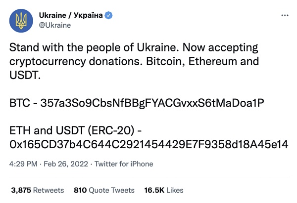 除了个人和民间组织,2月26日乌克兰政府也在其官方 Twitter 账户上发布了加密资产捐赠的请求。截止到3月4日,推文中列出的比特币、以太坊、TRON 和 Polkadot、Dogecoin 和 Solana 地址已收到超过 107,000 份加密货币捐款,捐款总额约为4840万美元。
