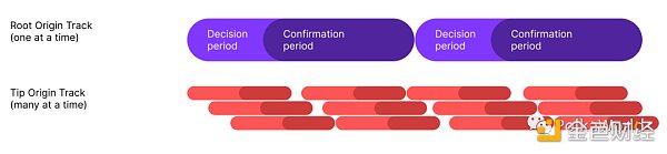 在 Gov2 中,我们允许提案者指定他们希望使用哪个来源来执行其议案。每个受支持的来源都与单个公投类别(即一类公投)相关联,大多数类别将对应一个来源,但可能有一些类别由多个来源组成。每个类别都有自己的轨道(Track),其实就是提案存在和走流程的管道,每个轨道完全独立于其他类别的轨道。