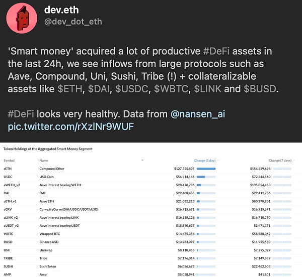 Twitter 上的一些用户也会关注 Nansen 统计的 Smart Money 资金动向