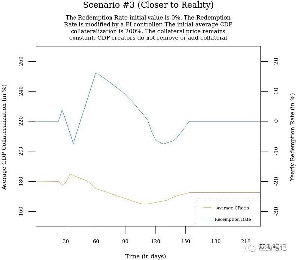 在第180天,两者的价格偏差为0(图1A)。现在,赎回利率变为0%,所有CDP的借贷能力停止增长(图1B)。