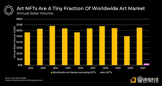 生成艺术 NFT 有很大的发展空间。2021 年的艺术 NFT (生成+数码艺术作品)销售额仅有 28 亿美元,仅占全球艺术品销量 650 亿美元的4.3%。不难想象,随着时间的推移,艺术 NFT 在整个艺术品市场将占据更大的份额。