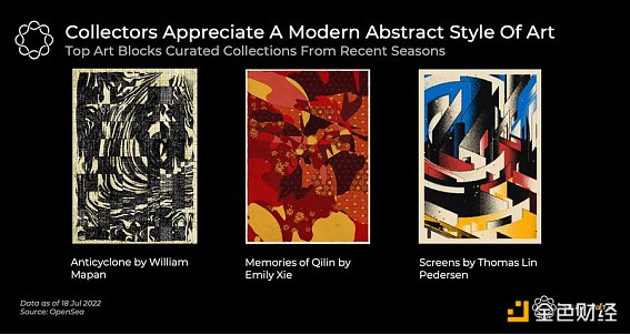 例如,目前 Art Blocks 平台上的收藏家群体钟情于现代抽象风格的艺术作品,这些作品色彩丰富,看上去近似于人类的画作,使用各种形状、颜色、形式来呈现视觉效果,并抽离于现实,打印出来之后挂在家里,显得很华丽。
