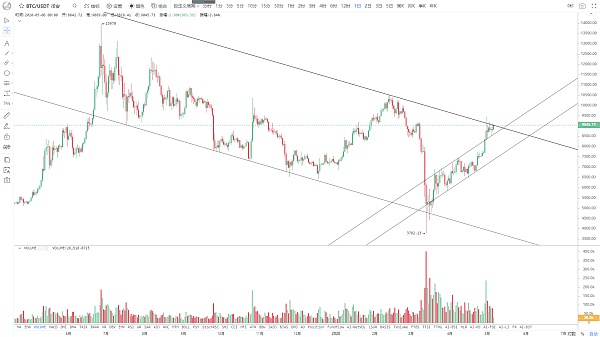 自前期大幅拉高后至目前日线走势,技术图形上看,这段时间明显受制于大下降通道上边线压制,前期年初行情的顶部10500区间也是受阻于这条压制线而后回落的,所以日线突破站稳,后续向上挑战前高将是大概率,今日该压制线点位处于9050附近,收盘站上将有望继续上行试压,而下方支撑我们可以看到,近期日线向下插针均触及小级别上升通道上沿而后快速收回,验证了其趋势支撑的有效性,当前点位支撑8600,目前日线处于这两线构筑的三角末端震荡,操作上日线站稳9050顺势加仓,下一近期阻力位于9450附近,不破8600继续持有为主。