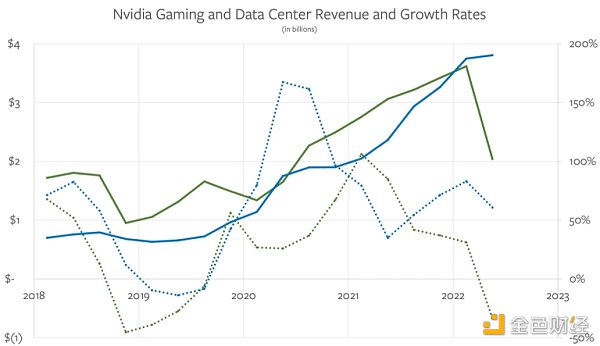 加密货币的走势与其说是山谷,不如说是悬崖:以太坊成功切换到权益证明(POS)模型,令由成千上万的英伟达 GPU 搭建出来的一整个矿场在一夜之间变得一文不值;鉴于另一个采用工作量证明的主要加密货币网络,也就是比特币,几乎完全是用定制设计的芯片来开采的,所以所有这些旧的 GPU 都涌入到二手市场。对于英伟达来说,这是一段特别糟糕的时期,因为该公司之前为了满足对 3000 系列芯片的需求而付出的努力正值收获回报之际,疫情带来的购买热潮却已经结束。不用说,太多的新库存再加上太多的二手库存使得公司的财务业绩糟糕无比,尤其是英伟达还在打算为新系列清理渠道: