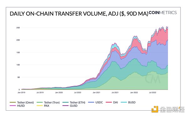 衡量采用情况的一个简单标准是链上转移的价值。使用相对较长的 90 天移动平均值窗口,每天在区块链上与稳定币交换的价值接近历史高点,每天 250 亿美元。其中约 200 亿美元来自 USDC(以太坊上)和 Tether(以太坊和 Tron)的转移。