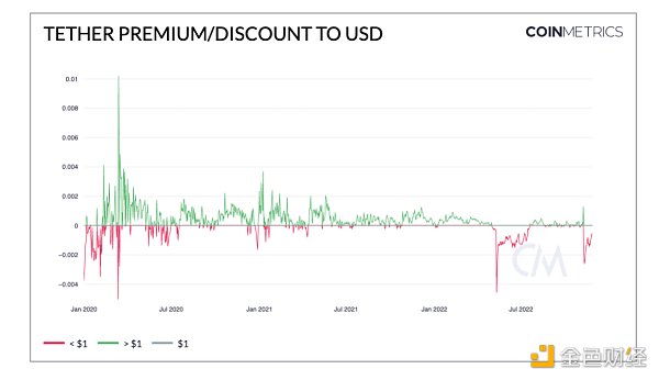 赎回是在 Tether 的价格略微低于其 1 美元挂钩的情况下进行的。这为某些较大的市场参与者创造了一个套利机会:他们可以在低于 1 美元的价格购买 USDT,并按面值赎回。不过,赎回的速度没有今年春天那么激烈,反映出对 1 美元挂钩的折扣没有那么严重。