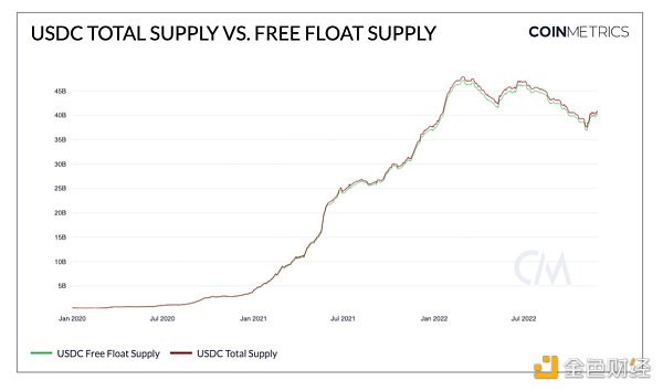 同时,另一个由法币支持的稳定币中坚力量 USDC,自 11 月 8 日以来经历了自由浮动供应的轻微上升,从 370 亿美元上升到 400 亿美元。
