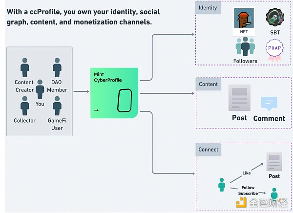 1、CyberProfile:去中心化身份,由用户拥有和管理,其链上的数据/资产都将映射到该身份中;