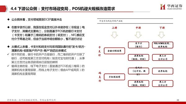 3、从软件及改造角度看,受益最确定、空间最大的是银行IT软件厂商,其次为机具及加解密厂商。从商业运营角度看,未来基于场景运营的厂商有望受益。