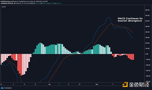 正如很多人分析的那样,日线MACD指标正在继续向下发散。第一幅图是本周的MACD表现,相比第二幅(上周MACD)信号线已经发散。如果想期待价格的上涨,蓝色MACD线需要率先开始向上移动。但是,如果MACD和信号线继续以这种向下发散,那么短期内都不可能指望价格出现大幅翻转。