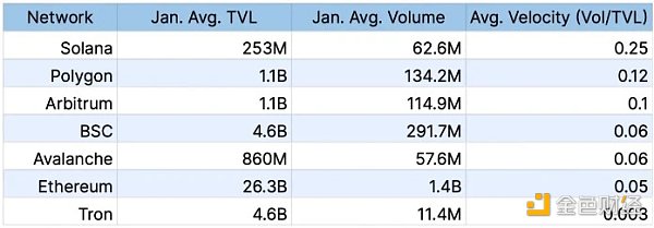 虽然锁仓量指标非常重要,但有时可能会产生误导,因为相关统计会被重复计算,因此指标数字略有夸大。相比之下,“DeFi Velocity”指标或许可以更好地反映跨链活动,该指标值= 24 小时 DEX 交易量/区块链锁仓量,数值越高,代表 DeFi 生态系统越活跃。