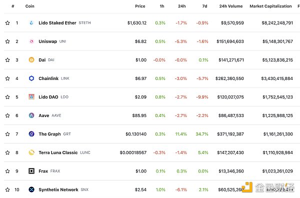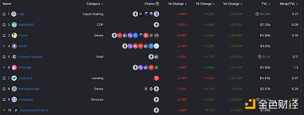 DeFi项目锁定资产前十排名及锁仓量 数据来源:defillama