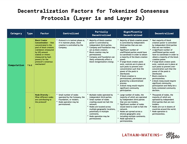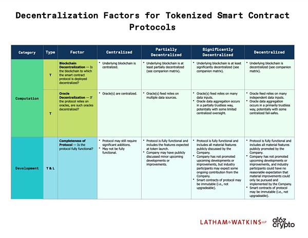 根据 SEC 的指导,我们可以将法律去中心化定义为一个 web3 系统能够消除重要信息不对称的潜在风险,并不依赖他人的重要管理工作来推动该企业的成功或失败的程度。达到这个阈值后,该系统可能被认为是“足够去中心化”,因此无需将美国证券法适用于该系统的代币。作为一个阈值问题,这要求特定代币不会赋予持有人与发行方或其附属机构的持续努力、资产、收入或资源相关的任何合同权利。