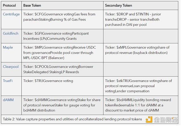 表2概述了表1中排名前6位的协议的价值捕获属性和效用。所有代币分别向持有者和质押者提供治理权力。此外,Maple、Centrifuge和TrueFi利用质押来换取二级收据代币(receipt token)。收据代币有时被设计为投票托管(ve)模型,也可以作为向忠实支持者分发费用分成的工具。在Centrifuge、Maple、TrueFi、Clearpool和dAMM的情况下,费用分成是直接给与或通过分散回购实现的。Goldfinch和Clearpool没有二级代币,而是直接使用它们的主要代币作为协议激励工具。所有原生协议代币都直接从产品使用中获得价值,或者通过前面提到的费用分成、治理,或者在质押代币方面提供用户优势。这意味着可以期待所有代币都具有这种协议采用和代币估值之间的相关性。