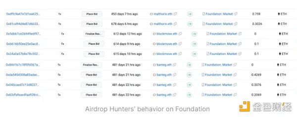 我们随机抽取了三位参与过 Foundation 的空投猎手,发现他们在 Foundation 的互动并不频繁。尽管有两名空投猎手实际上购买了 NFT,但大多数互动都是对 NFT 进行出价。