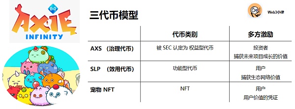 肖风博士提出的三代币模型并不是一个全新的概念,而是一个对现有市场代币经济活动的总结。自 2020 年链游老大 Axie Infinity 采用三代币模型(双代币 +NFT)模型以来,三代币模型几乎成为 GameFi 领域标配。尤其最近在美国证券交易委员会(SEC) v. Coinbase 的案件中,SEC 直接将 AXS(Axie推出的治理代币) 定义为权益型代币,暂且不论对错,但这使得三代币模型的定义更加清晰。