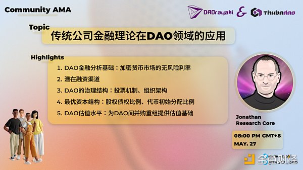 尽管与公司制存在较大不同,但传统公司金融的研究框架也可应用于DAO,为DAO治理和未来可能面临的资本运作提供理论参考。类比公司金融在分析,DAO金融分析的一个基本框架是从①加密货币市场的无风险利率(尽管这一利率可能并不存在)出发,对外分析②潜在融资渠道,对内分析③DAO的治理结构(投票机制、组织架构)、④最优资本结构(股权债权比例、代币初始分配比例),从而测算⑤DAO估值水平,为DAO间⑥并购重组提供估值基础。对标公司金融,DAO治理的目标应当是治理代币持有者全体利益最大化,但这一结论尚未达成市场和学界共识,DAO资产规模最大化、治理代币和效用代币持有者全体利益最大化、DAO估值最大化等等也可能成为DAO治理目标,市场共识会走向何方且待观察。本文将以治理代币持有者全体利益最大化为DAO治理目标作为出发点,从无风险利率、潜在融资渠道、治理结构、最优资本结构、估值水平、并购重组六个方面简单讨论DAO金融。