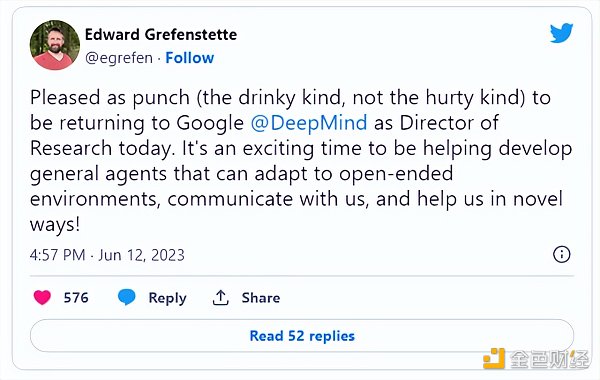 人工智能专家Edward Grefenstette上个月也加入了谷歌研究小组DeepMind,开发能够适应开放环境的通用代理。
