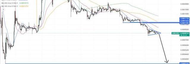 如果它能够突破三角旗结构的北部及其21日均线,则有可能迅速恢复至0.0001160美元区域的支撑转阻力位,比当前水平高出约36%。