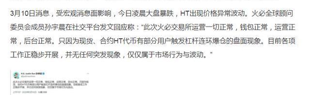 随后孙割也做出回应:HT短时暴跌:火B运营一切正常,盘面现象属市场行为与波动