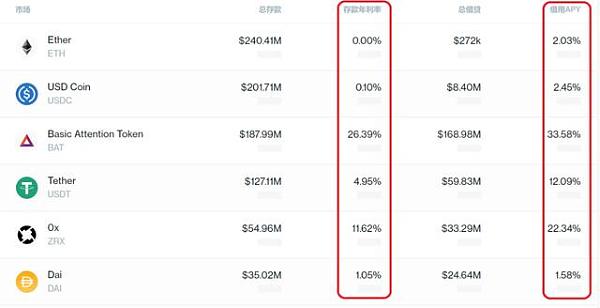 上图中从左往右看,第一个红框所标示出的是代币的年化存款利率,第二个红框所标示出的是代币的年化借款利率。
