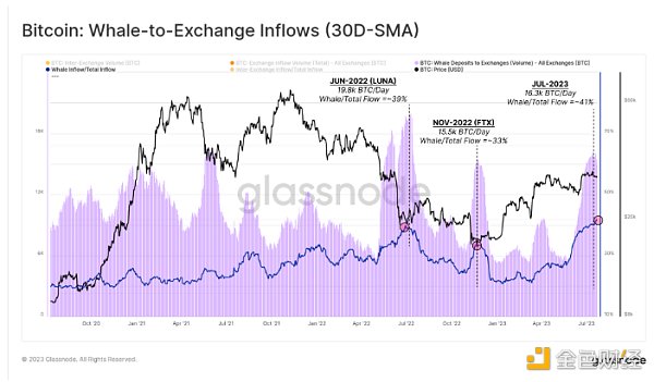在最近的反弹中,巨鲸流入交易平台的数量显着增加,达到每天+1.63万 BTC。这是占所有交易平台流入量 41% 的巨鲸主导地位,与 LUNA 崩溃 (39%) 和 FTX 失败 (33%) 相当。