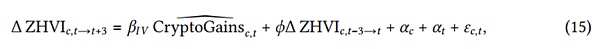 对于????为了恢复出县级加密货币财富增长对房价的因果效应,先前一年内县级加密货币财富的增长必须与未来的房价无关。有两个原因不太可能出现这种情况。首先,方程10可能存在逆向因果关系——在某一地区,房价上涨可能导致家庭出售加密货币来购买房屋,从而降低了县级加密货币投资组合的价值。根据这种加密货币提取后加密货币价格的变动情况,瞬时OLS估计可能出现偏差。其次,变得更富有的县很可能房价上涨,并且可能还会有更大的加密货币存款。这个被忽略的变量可能会使本文的OLS估计值上升。