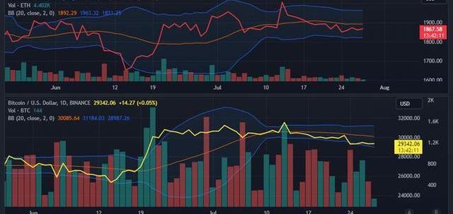 布林带指标是市场波动性减弱的另一个证明。自六月反弹以来,这两种资产的区间都收窄,这证明了缺乏垂直运动。