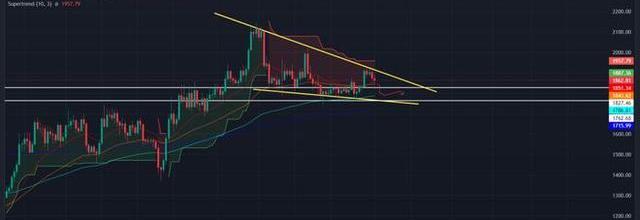 截至撰写本文时,ETH价格为1,862美元,在过去24小时内下跌超过0.45%。如果卖家将价格拉低至1,827美元以下,则ETH价格可能会跌至1,762美元,随后进一步跌至楔形支撑线。