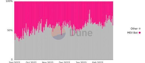 现实与否,这是UNI在BTC术语中的市值所收取费用的下降可能归因于Uniswap协议上的大量机器人活动。DuneAnalytics的数据表明,MEV机器人占DEX总交易量的41.1%。