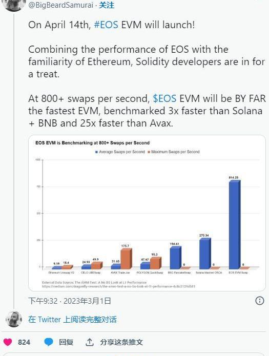 “将EOS的性能与以太坊的熟悉程度相结合,Solidity开发人员将大饱口福,”Rose上周发推文说。“每秒交换800多次,$EOSEVM将成为迄今为止最快的EVM,基准测试比Solana+BNB快3倍,比Avax快25倍”